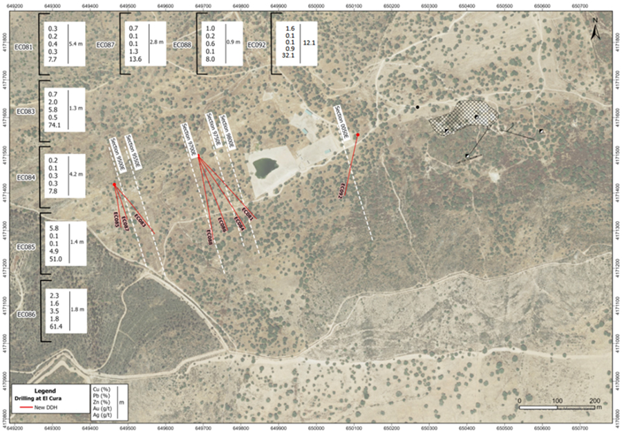 - Drill hole EC092: 12.1m grading 1.6% copper, 0.1% lead, 0.1% zinc, 0.85 g/t gold and 32.11 g/t silver.