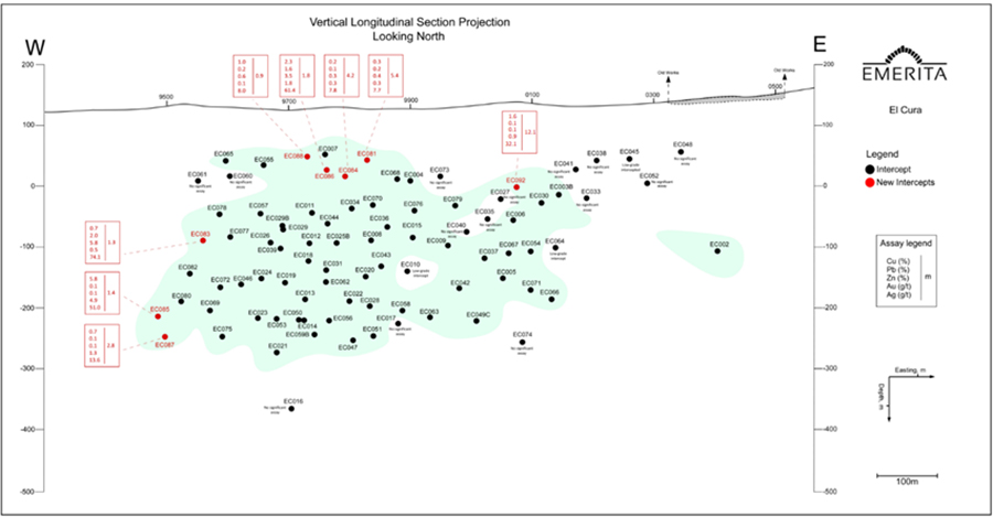 According to Joaquin Merino, P.Geo., President of Emerita, “The El Cura deposit continues to expand with very good grades of base metals and gold. The deposit has only been drilled to moderate depths which allows us to cost-effectively continue to drill the deposit in sufficient detail to be classified primarily as measured and indicated resources, which provides conversion to reserve categories in the forthcoming prefeasibility study.”