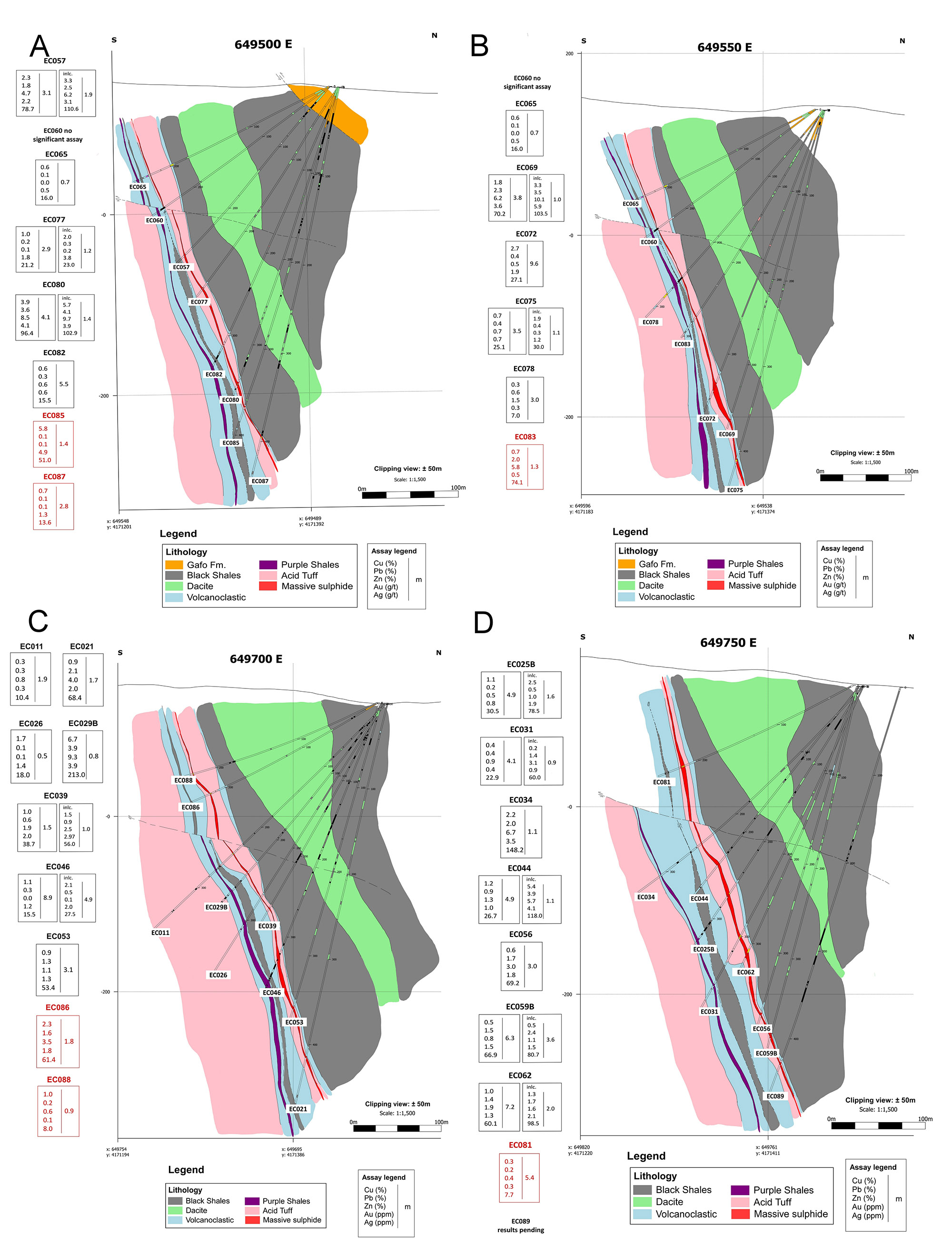 Figure 4. Geological cross sections. A: Section 649500E showing holes EC085 and EC087. B: Section 649550E showing holes EC083. C: Section 649700E showing holes EC086 and EC088. D: Section 649750E showing hole EC081.