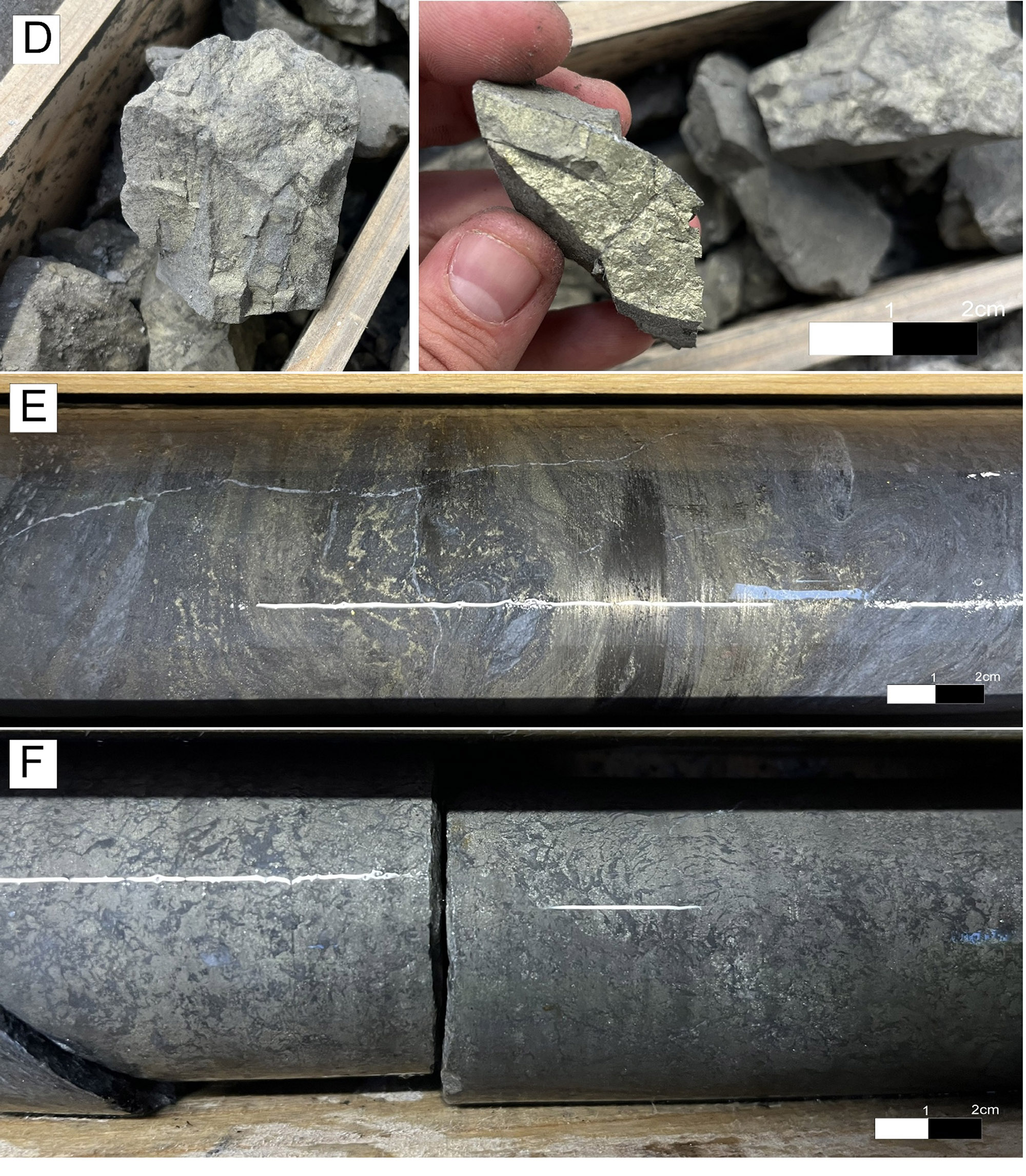 Figure 5 continued. Photoplates of El Cura drillcore as described in this release: D: EC085 fractured massive sulphide chalcopyrite rich E: EC086 semi-massive polymetallic sulphide with millimetric chalcopyrite/galena/sphalerite veinlets/crystals F: EC087 pyritic massive sulphide with millimetric euhedral chalcopyrite crystals.