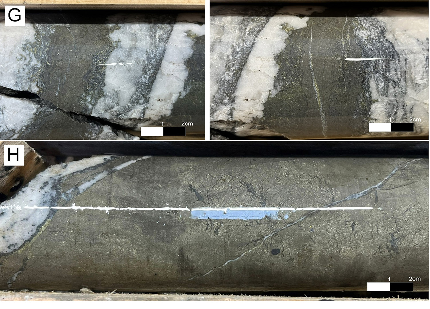 Figure 5 continued. Photoplates of El Cura drillcore as described in this release: G: EC088 sulphide bands within a felsic tuff with pyritic matrix and veinlets of chalcopyrite, locally sphalerite/galena rich. H: EC092 pyritic massive sulphide with chalcopyrite crystals, and chalcopyrite as veinlets associated with quartz.